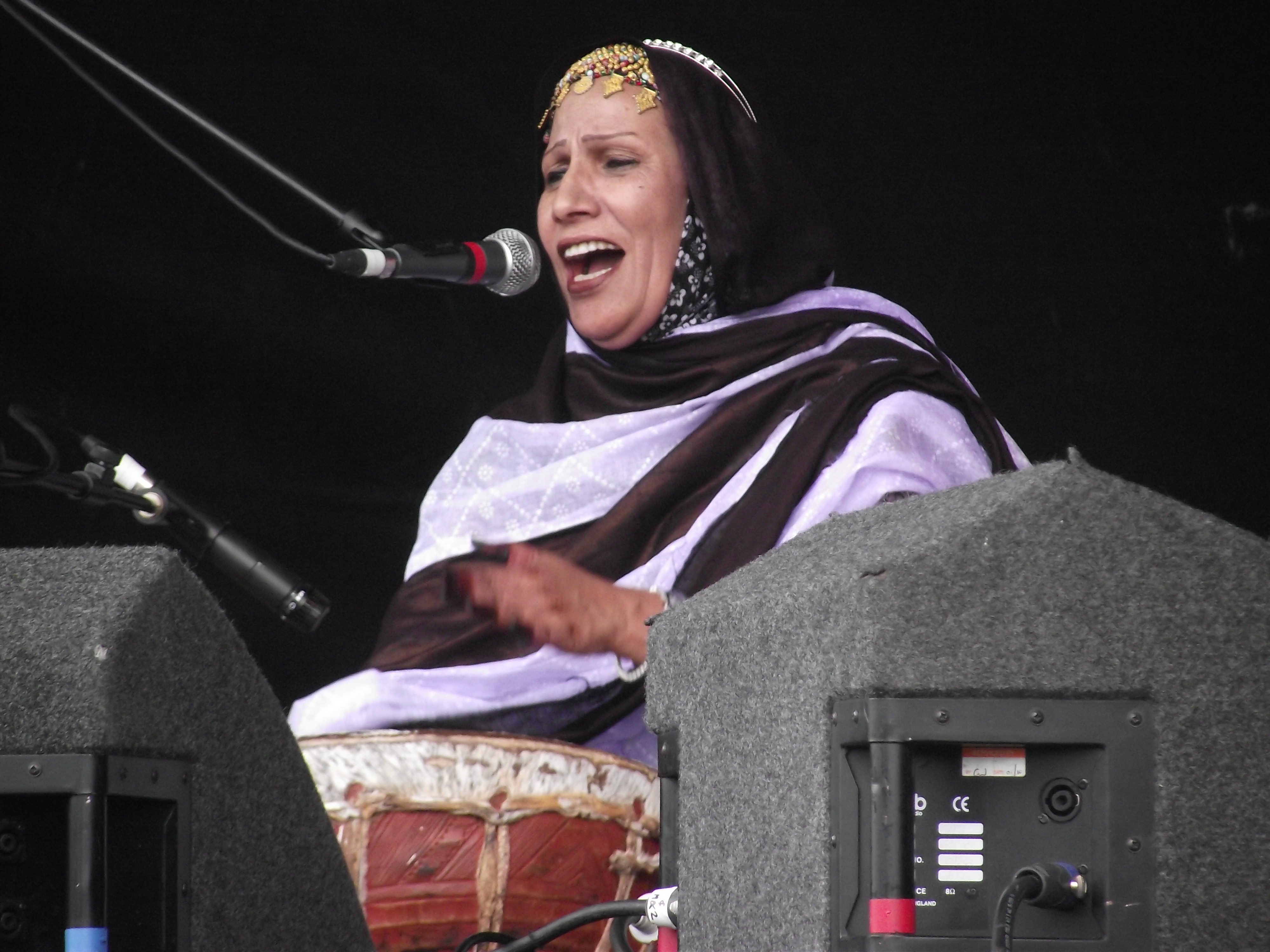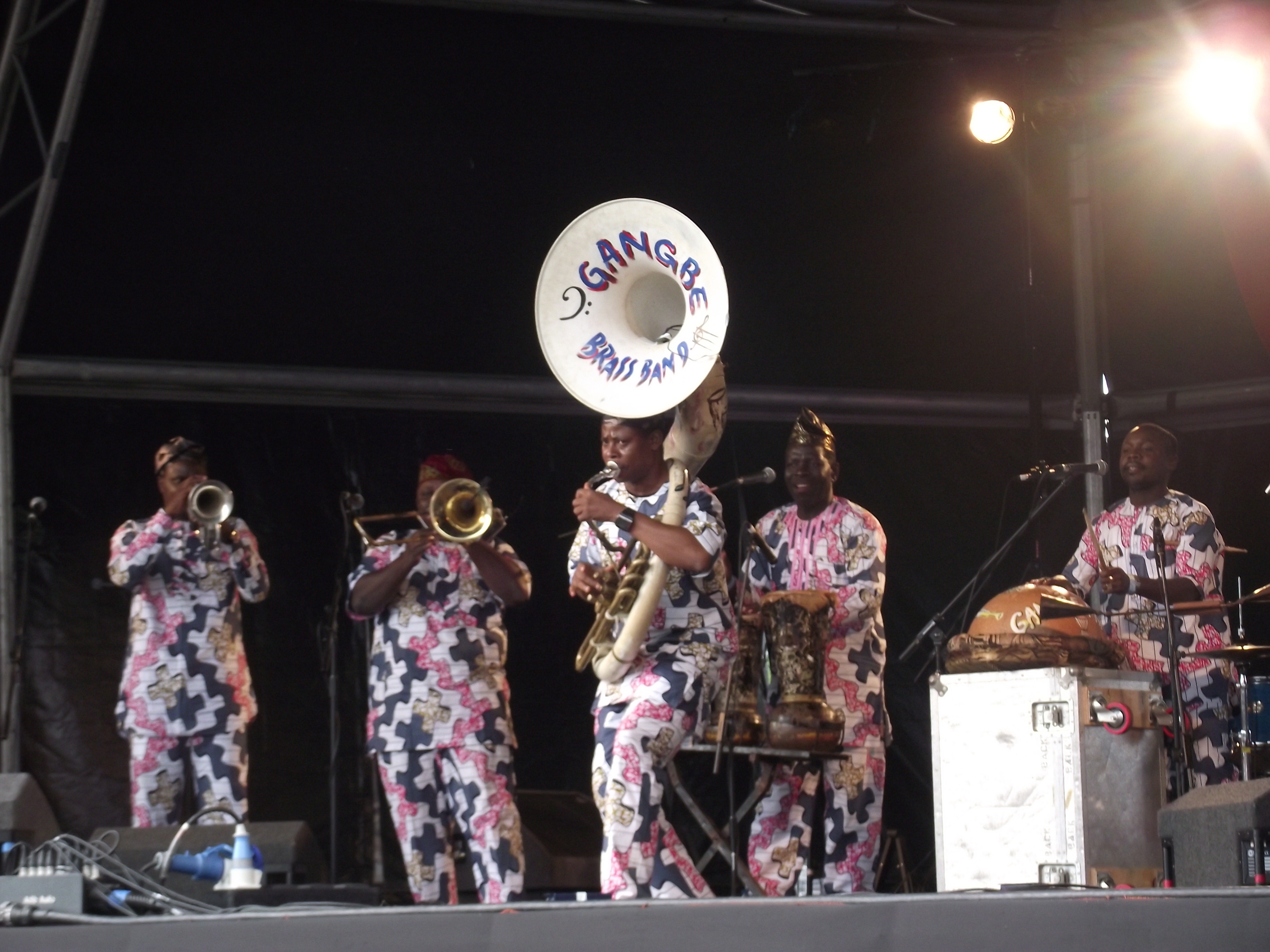 On Saturday afternoon I arrived at Sefton Park just as the first act of the day was being introduced. Mariem Hassan is incredible singer from the Western Sahara, accompanied by a pair of guitarists who played the blues with an unbelievable passion. Mariem was my first interviewee of the day, and set the pattern for how most of the rest of the day’s interviews would go; after agonising between her manager/interpreter (who’s German) and myself, I discovered that she spoke fluent Spanish and so I ended up interviewing her en Español. As Saturday progressed, language barriers proved to be more a source of amusement than a hindrance – especially when Maya, Geli and I did an interview en masse with the Ganbgé Brass Band.