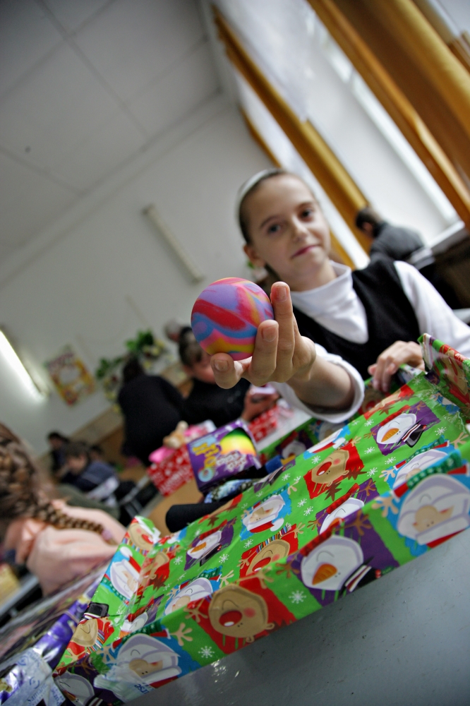 Our first distribution is in the imaginatively named Secondary School No. 4. This school is 300 years old and is the oldest school in the Crimea (which makes you wonder why it isn’t Secondary School No. 1 – but hey, I don’t make the names). I amble about the school’s reception area and am immediately accosted by a handful of girls who want to have their picture taken with me. We take pictures, the school bell rings, and we’re all carted off into a classroom where a handful of kids are given pressies.