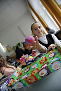 With two distributions and a couple of home visits done, there was still more work to do before wrapping up today’s packed schedule. On to another internat we went. Again, the sweet bread got passed round as we watched some more singing and dancing… and then off to our fourth and final distribution of the day, in another orphanage nearby. This one looked as if it had recently had some work done on it. We sat in the library/IT room and met with a group of kids there; another group of kids from another orphanage close by were bussed in to meet with us and receive gifts. Today’s “Aww” moment came when one little girl who had always dreamt of having her own Slinky spring opened up her shoebox and found one inside.